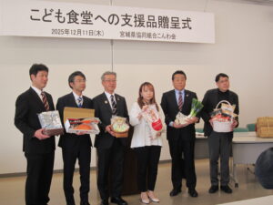 宮城県協同組合こんわ会(構成団体:宮城県農業協同組合中央会・宮城県生活協同組合連合会・宮城県漁業協同組合・宮城県森林組合連合会)は、12月11日(木)みやぎ生協文化会館ウィズにおいて、「こども食堂への支援品贈呈式」を開催しました。こども食堂の運営者、関係者53人が参加しました。 「みやぎこども食堂ネットワーク」に加入する114団体のうち、希望のあったこども食堂50団体に贈呈しました。